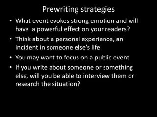 This document provides strategies for writing an effective narrative. It begins by defining narration as telling a single or related story. It then lists some prewriting strategies such as focusing on a personal experience or public event that evokes strong emotion. The main points of focus are identifying the internal or external narrative conflict, developing only relevant details, and organizing the narrative sequence through techniques like flashbacks. Additional tips include making the narrative easy to follow with clear paragraph focus and time signals, as well as making it vivid through sensory details, dialogue, and active verbs while maintaining a consistent point of view and verb tense.