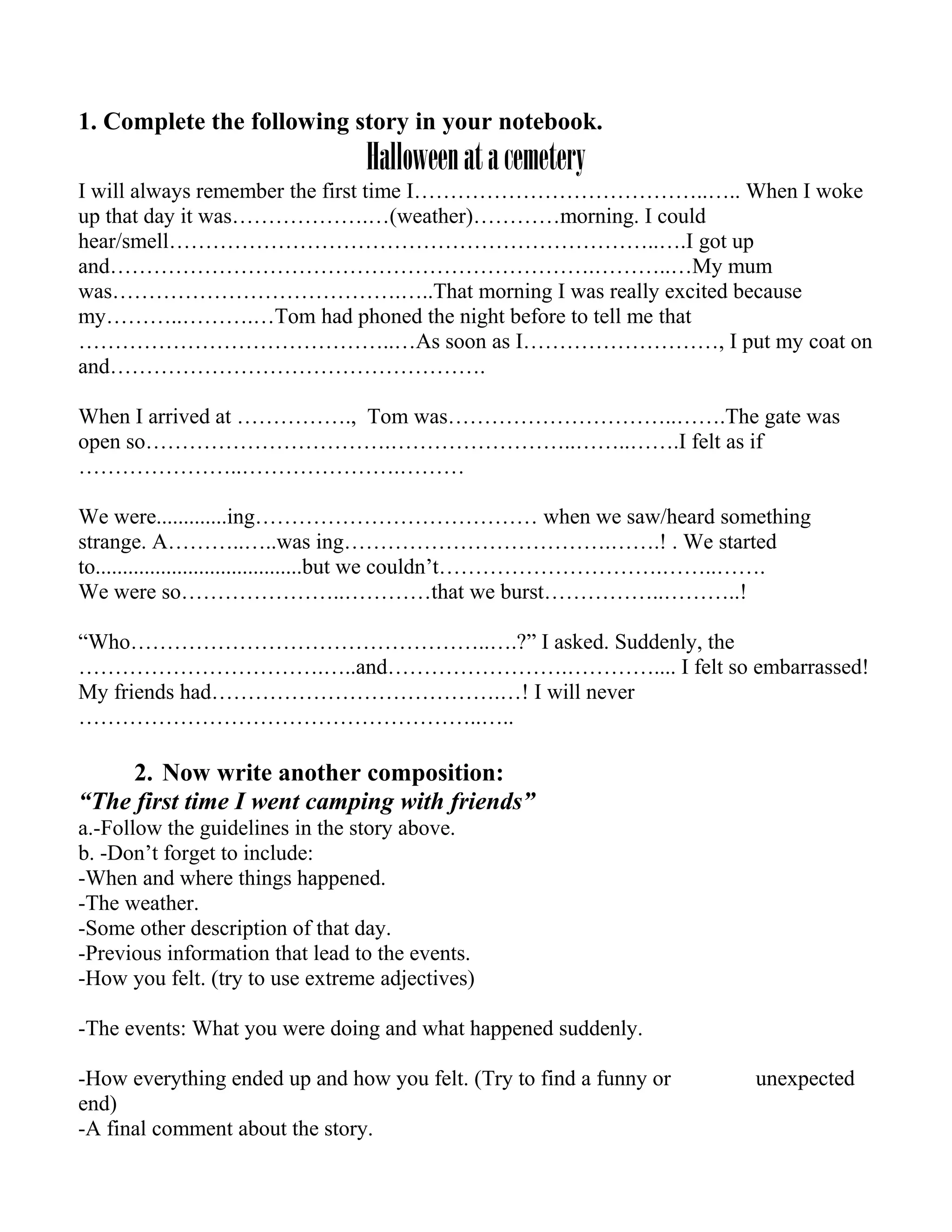 The document contains an unfinished story prompt about Halloween at a cemetery and asks the reader to complete the story in their notebook. It also provides guidelines for writing a second story about a camping trip with friends, including when and where it took place, the weather, descriptions of events and feelings.