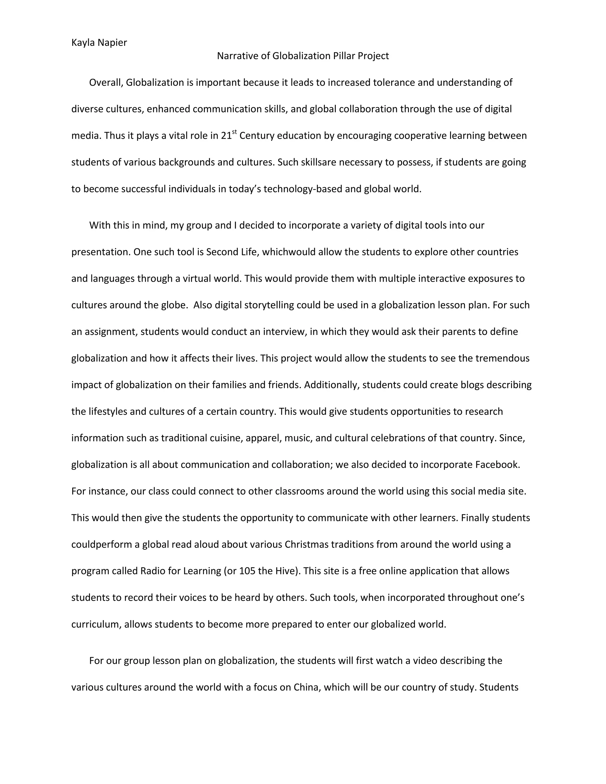 This document discusses a lesson plan for teaching students about globalization. The plan uses various digital tools to provide interactive experiences with different cultures. Students will first watch a video about world cultures, with a focus on China. They will then be given a virtual tour of China and connect with a Chinese classroom to collaborate with students there. American students will be assigned Chinese "web pals" to correspond with using Skype and Epals to share information about their cultures. For assessments, students will create individual travel commercials about China and collaborative PowerPoint presentations comparing American and Chinese cultures with their web pals. The goal is for students to better understand different cultures through global collaboration and communication using technology.