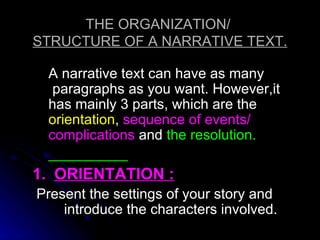 This document summarizes the key elements of a narrative text. A narrative tells a story and can be imaginary or based on real events. Its purpose is to entertain readers. There are different types of narratives like short stories, folktales, legends, fables, and myths. A narrative follows an organization structure with three main parts - an orientation that introduces the setting and characters, a complication where events lead to a conflict, and a resolution where the story is resolved and comes to an end.