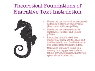 This document discusses the theoretical foundations and instruction of narrative and expository texts. Narrative texts tell stories to entertain, while expository texts inform by providing facts. Both have distinct text structures that teachers should teach students to identify in order to improve comprehension. Evidence-based techniques shown to be effective for instruction include graphic organizers, question generation, and summarization. The document demonstrates how to use a character perspective chart for narrative texts.