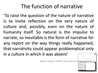 ![‘[A story is] the chopped off length of the tape worm of time ... a narrative of events arranged in their time sequence. A plot is also a narrative of events, the emphasis falling on causality…’E.M Forster. Quoted in:Burroway, J. (2007). Writing Fiction: a Guide to Narrative Craft.](https://image.slidesharecdn.com/narrative-100215215046-phpapp02/85/MED316-Narrative-Construction-17-320.jpg)
