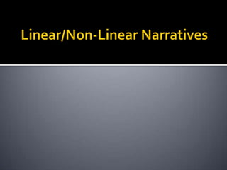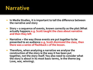 The document discusses various narrative theories and how they apply to Christopher Nolan's Dark Knight trilogy of Batman films. It explains key concepts like narrative vs story, linear vs non-linear narratives, Vladimir Propp's character archetypes seen in the films, and theories from Todorov, Levi-Strauss, and Barthes that provide ways to analyze the narrative structures. Examples are given of how The Dark Knight specifically incorporates elements like binary oppositions between Batman and the Joker.