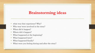 This document provides an outline for writing a narrative essay about the most memorable National Day experience in Oman. It includes brainstorming ideas about what happened, who was involved, when and where it took place. The outline then structures the essay into an introduction with a thesis statement, three body paragraphs describing the events of the morning, afternoon and evening, and a conclusion paragraph that restates the thesis and provides a summary and concluding thoughts.