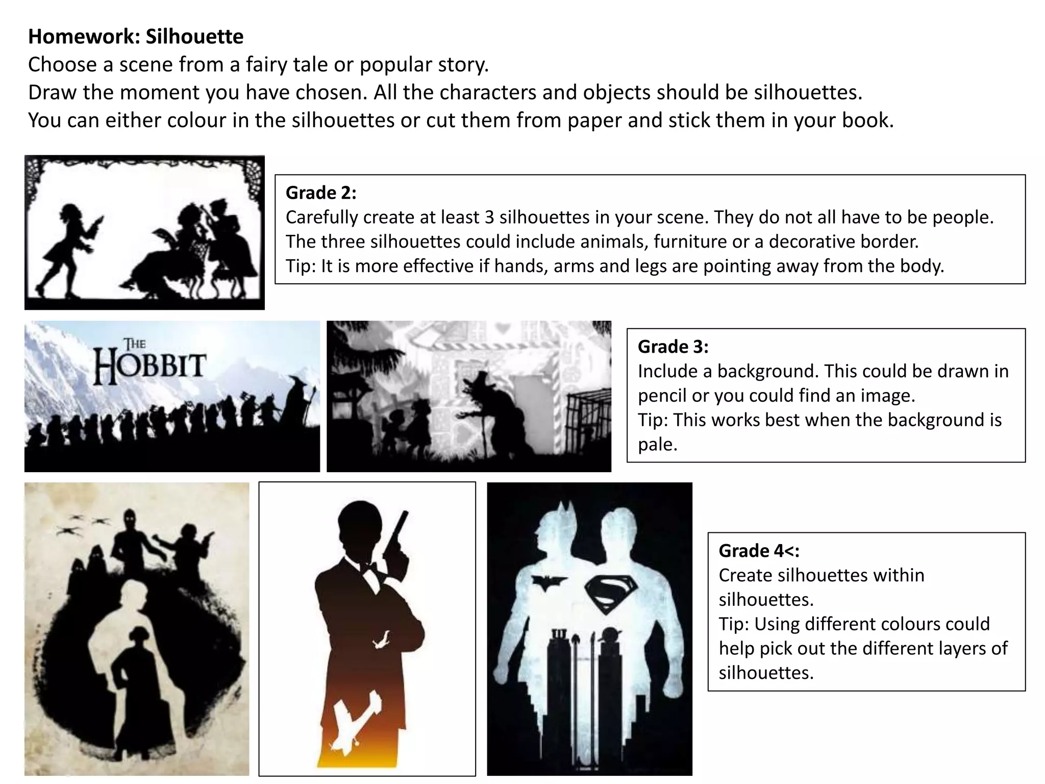 Students are to choose a scene from a fairy tale or story and draw it as silhouettes. For grade 2, they should include at least 3 silhouettes that can be characters, animals, furniture or a border. For grade 3, they should add a background drawn or found. For grade 4, they should create silhouettes within other silhouettes, and different colors could help distinguish the layers.