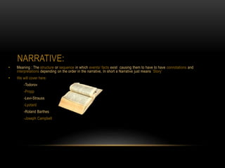 The document discusses various narrative theories in film, including the five-act structure by Todorov, Propp's eight character roles, Levi-Strauss's binary oppositions, Barthes's five narrative codes, and Campbell's concept of the monomyth. It explains how these theories influence storytelling by establishing character dynamics, narrative structure, and thematic depth. The author reflects on how these theories are applied in their own narrative about a girl coping with the loss of her mother.