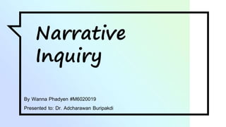 The document presents narrative inquiry as a qualitative research method that utilizes storytelling to understand social experiences. It outlines the process of narrative research, which involves collecting individual stories, restorying them, and validating the accuracy through collaboration with participants. The document also discusses common characteristics, critiques, and validation practices associated with narrative research.