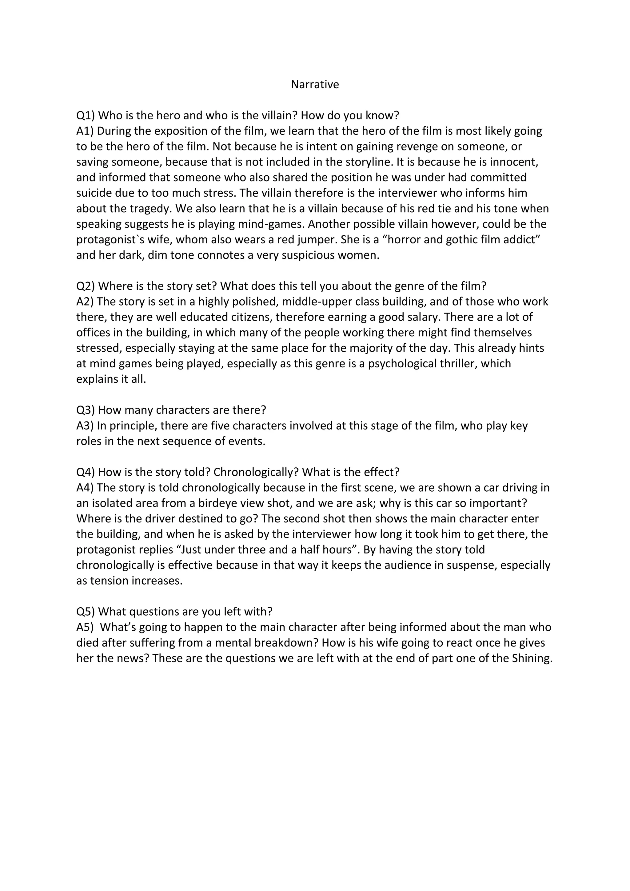 The summary analyzes a psychological thriller film based on the questions and answers provided. The hero is the protagonist who is informed by his interviewer that another employee committed suicide due to stress. This makes the interviewer the villain as his red tie and tone suggest he is playing mind games. The story is set in a polished upper-class building where many employees work in offices and may feel stressed. There are five main characters introduced so far. The story is told chronologically to build suspense as tensions rises for the protagonist after learning about the previous employee's death. The questions left are how the protagonist will react and how his gothic film-lover wife will respond.