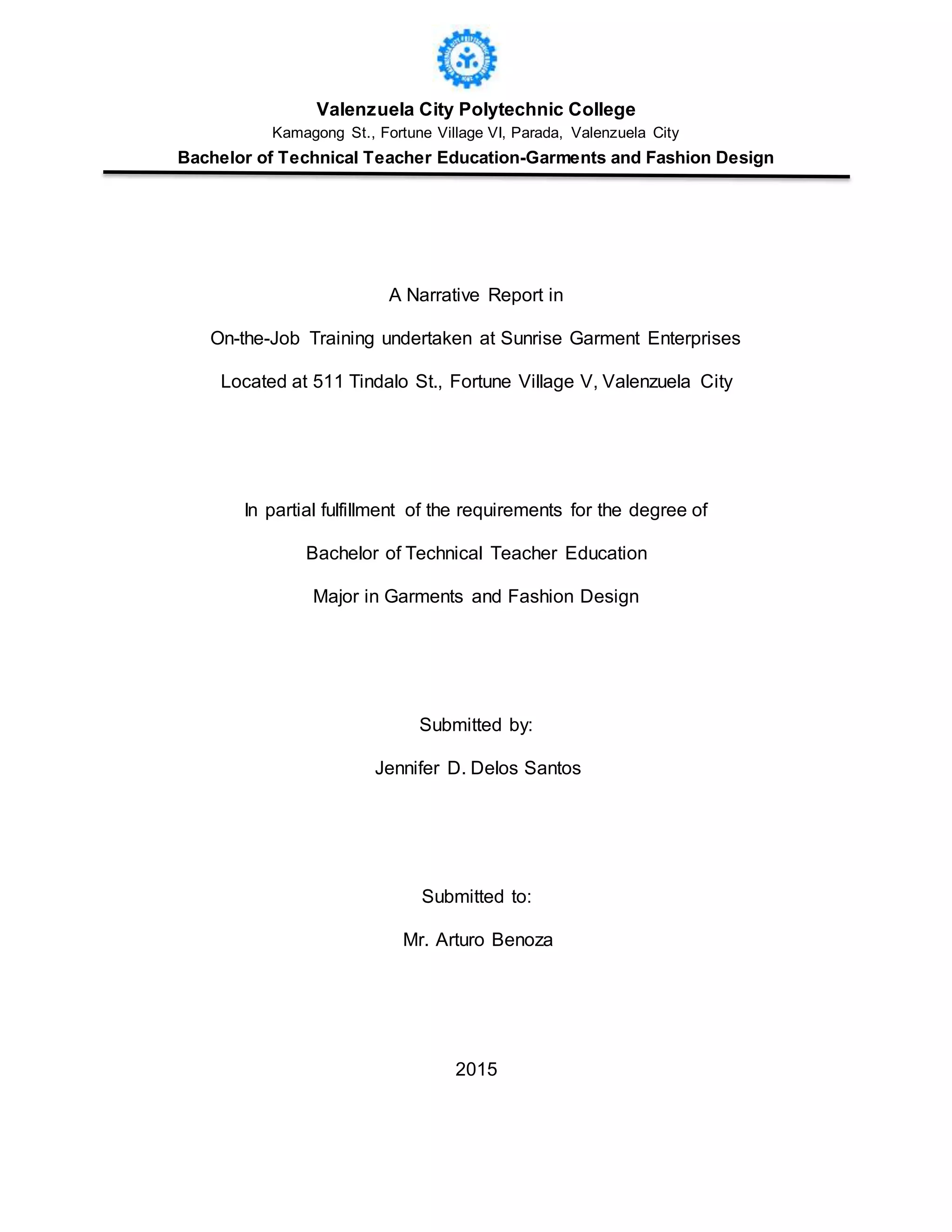 Jennifer Delos Santos completed her on-the-job training at Sunrise Garment Enterprises in Valenzuela City. During her 288 hours of training over 2 months, she learned sewing skills like using edging machines to join shirt pieces and attach sleeves. She gained experience sewing over 12,000 pieces of clothing. The training helped improve her skills in sewing neatly and working efficiently in a production environment. She concluded that the training improved her abilities and gave her confidence for future success in the garment industry.