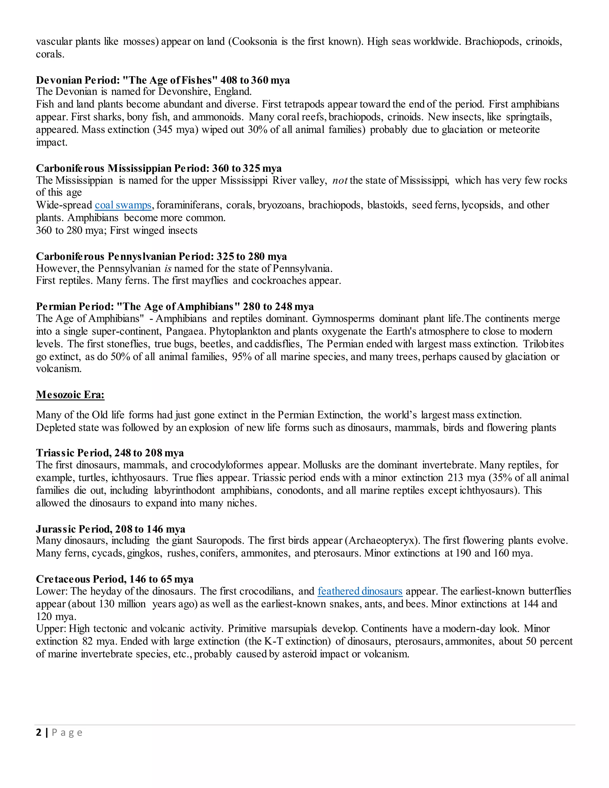1. The document outlines the major periods in the geologic history of Earth from the Precambrian Eon to the present Cenozoic Era. It describes the major life forms, events, and changes that occurred during each period.