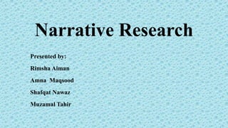 This document provides an overview of narrative research. It discusses how narrative research is concerned with how individuals make sense of the world through stories. It outlines the history of narrative psychology, including influential books in the field. It describes key characteristics of narrative research such as flexibility, focusing on individual experiences, collecting stories, and collaborating with participants. It also discusses types of narrative designs, data collection methods, analyzing narratives, and addressing ethical concerns regarding story authenticity and memory accuracy.