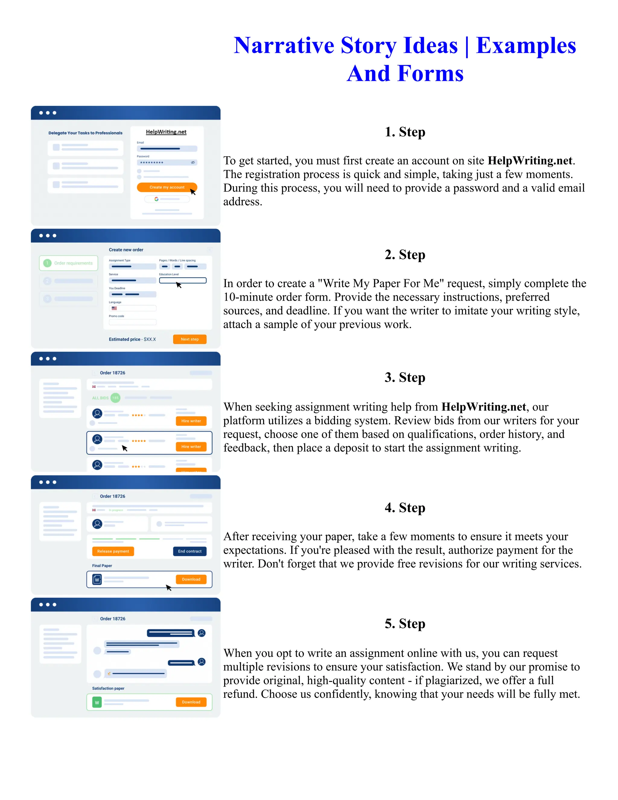 The document provides instructions for requesting writing assistance from HelpWriting.net. It outlines a 5-step process: 1) Create an account with an email and password. 2) Complete a 10-minute order form providing instructions, sources, and deadline. 3) Review bids from writers and choose one. 4) Review the completed paper and authorize payment. 5) Request revisions until satisfied with the work. The document emphasizes HelpWriting.net's commitment to original, high-quality content and full satisfaction.