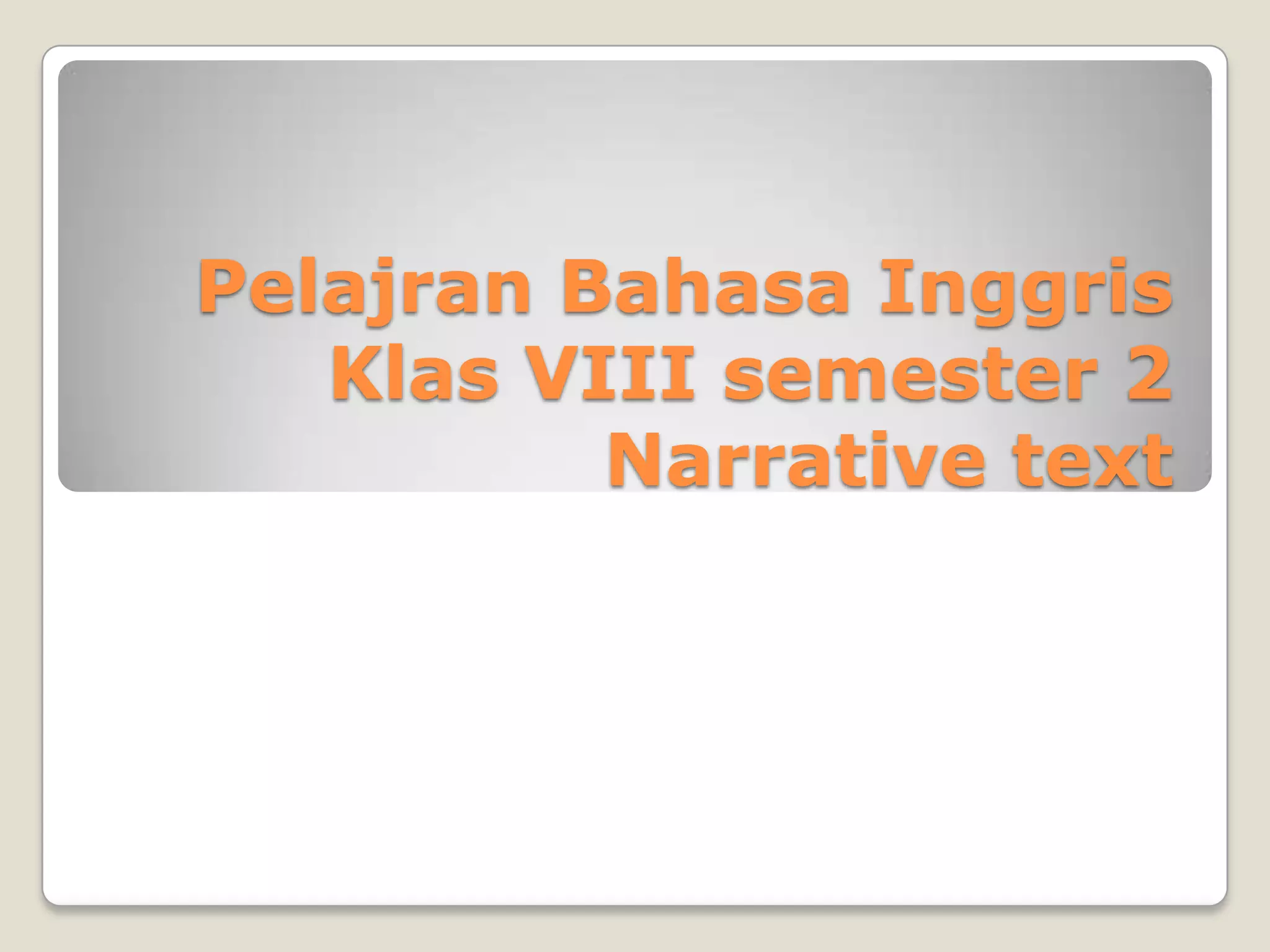 This document provides information about narrative texts for 8th grade Bahasa Inggris class. It defines narrative text as a text that relates a logical series of events in chronological order related to experiences of characters. It discusses the typical parts of a narrative text including orientation, complication, sequence of events, resolution and coda. It also describes common linguistic features of narrative texts such as specific participants, action verbs, past tense, and descriptive language. The document provides examples of questions that can be asked about narrative texts.