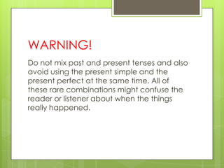 This document provides information about various past tenses in English including the past simple, past continuous, past perfect, and past perfect continuous. It explains that the past simple expresses completed actions at specific times in the past or past habits. The past continuous describes ongoing or interrupted past actions. The past perfect is used to talk about actions that occurred before other past events. And the past perfect continuous expresses actions that started in the past and continued up until another past time or were interrupted by another past action. Examples are given for each tense.