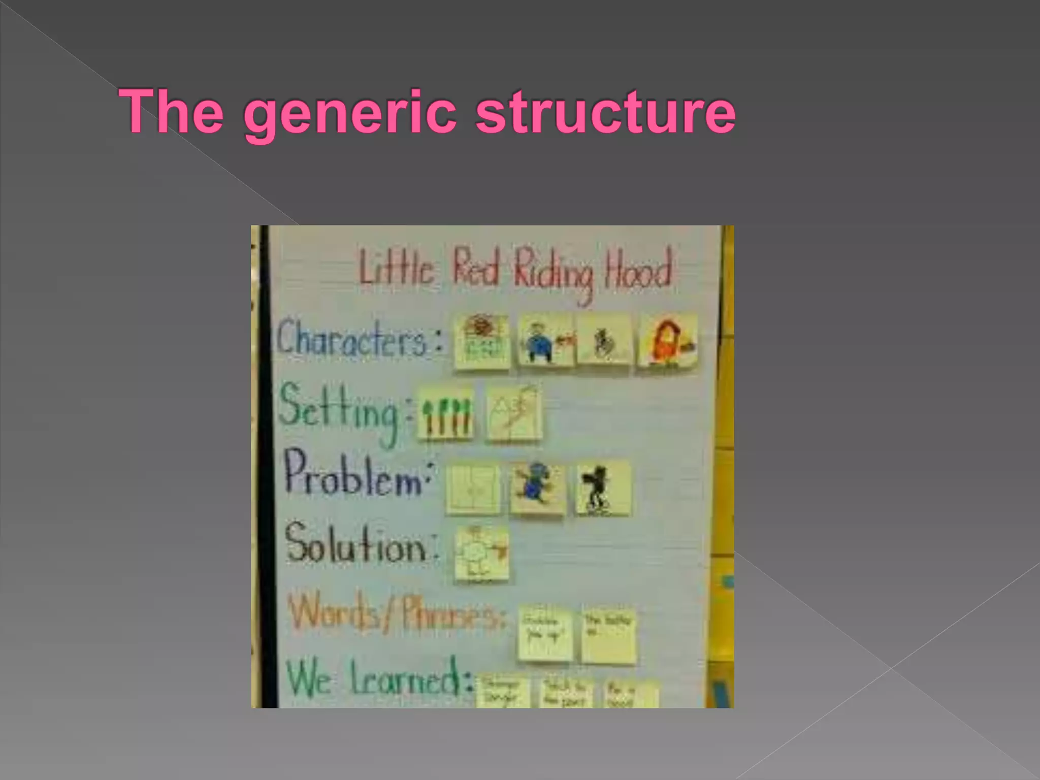 This narrative text retells the story of Little Red Riding Hood. It describes how Little Red Riding Hood's mother asked her to take a basket of goods to her grandmother's cottage. On the way, she met the Big Bad Wolf who asked where she was going. The wolf arrived at the grandmother's cottage first, locked her in a cupboard, and waited in her bed disguised as the grandmother. When Little Red Riding Hood arrived, the wolf pounced on her but woodcutters rescued them and chased the wolf away. Little Red Riding Hood learned not to talk to strangers.