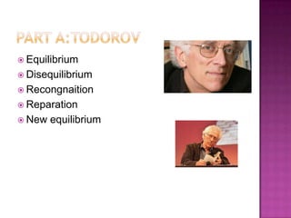 The document discusses various concepts related to narrative structure in films. It begins by defining key concepts like equilibrium, disequilibrium, and resolution. It then provides examples of how these concepts are shown through characters and their relationships changing in the film 27 Dresses. The document also discusses how films can use codes like actions, enigma, symbolic, semantic and cultural to tell stories and activate audiences. It analyzes how Propp's character archetypes like villain, dispatcher and hero are represented in the film Shrek 2. Finally, it briefly touches on concepts like diegesis, narrative range, and modular narratives involving techniques like forking paths.