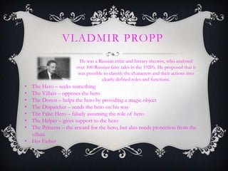 This document discusses several narrative theorists and their contributions to understanding narratives. Vladimir Propp analyzed Russian fairy tales and identified character types and their common roles/functions. Tzvetan Todorov proposed that most narratives follow a pattern of equilibrium, disruption of equilibrium, and return to a new equilibrium. Roland Barthes identified five codes that help audiences make sense of narratives: action, enigma, symbolic, semic, and cultural. Levi Strauss examined how stories unconsciously reflect a culture's values and beliefs through binary oppositions. The document provides examples of each theorist's work to analyze narratives.