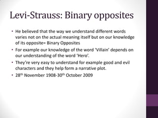 Levi-Strauss believed that narratives rely on binary opposites like hero/villain to help form plots. Todorov's theory proposes films follow five stages: equilibrium, disruption, recognition, attempt to repair, new equilibrium. Propp argued character functions structure folk tales, with roles like hero, villain, donor. Non-linear narratives can be cohesive like disruptive, non-sequential, or disjointed, or non-cohesive like ergodic, branching, or multi-linear.