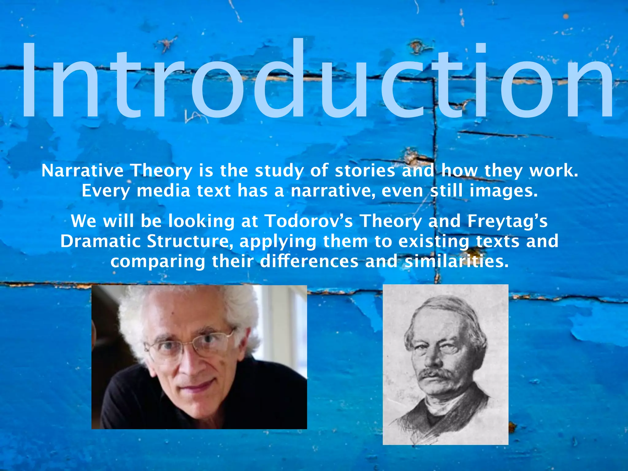 The document discusses narrative theory, focusing on Todorov’s and Freytag’s approaches to storytelling, highlighting their structures, applications, and criticisms. While Todorov's theory presents a simpler, linear narrative applicable to modern media, Freytag’s more complex structure, though historically significant, is often deemed outdated for contemporary texts. Both theories share similarities in narrative progression but differ in their applicability to various genres.