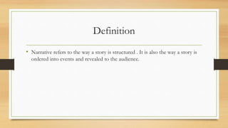 The document discusses several narrative theories and how they relate to psychological horror films like The Shining. It outlines Todorov's narrative structure of equilibrium, disruption, and new equilibrium. It also discusses Propp's 8 character types and 31 functions that can be applied to films. Additionally, it discusses Levi-Strauss's theory of binary oppositions seen in films pitting good vs evil. Finally, it analyzes Roland Barthes' 5 codes - hermeneutic, proairetic, semantic, symbolic, and cultural - that are woven into narratives to develop tension and meaning.