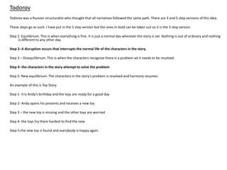 Todorov believed that all narratives followed the same basic structure of three or five steps: equilibrium, disruption, disequilibrium, attempted resolution, and new equilibrium. He provided the example of the story structure in Toy Story. The author explains they applied Todorov's five-step structure in their short story about a fox whose lunch runs away.