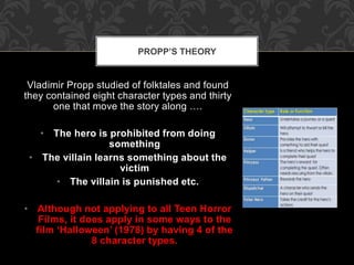 The document discusses several narrative theories and how they may apply to teen horror films and the opening sequence of a film project. It summarizes Vladimir Propp's theory of character types and plot events in folktales. It then explains how the proposed opening fits some of Propp's character types and follows some of the events he identified. Next, it outlines Claude Levi-Strauss's theory of binary oppositions driving narratives and provides some examples that are often seen in teen horror films. Finally, it briefly introduces Roland Barthes' concept of an "enigma code" using mystery and questions to engage audiences.