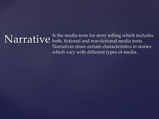This document discusses narrative theories and several theorists. It explains that narratives share characteristics across different media types and can be fictional or non-fictional. It provides biographical information on Claude Levi-Strauss, noting he was influential in showing culture is a system with underlying structures common across societies. It outlines Tzvetan Todorov's 5-step theory of narrative structure involving an equilibrium disruption, recognition, action, and new equilibrium. Finally, it mentions Roland Barthes and that Todorov suggested narrative has 5 codes including action, enigma, symbolic, semonic, and cultural.