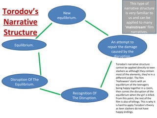 The document discusses several narrative theories and their application to teen slasher films. It describes Vladimir Propp's characterization of 8 character types and 31 narrative functions but notes this theory is difficult to apply to teen slashers, which lack generic heroes. Torodov's narrative structure of equilibrium, disruption, recognition, repair and new equilibrium is also challenging to apply as teen slashers don't have happy endings. However, Levi-Strauss' concept of binary oppositions around themes like good vs evil can be easily applied. Additionally, Roland Barthes' idea of enigma codes, where mysteries are unsolved until the end, is clearly demonstrated in films like Scream by the unknown killer's identity.