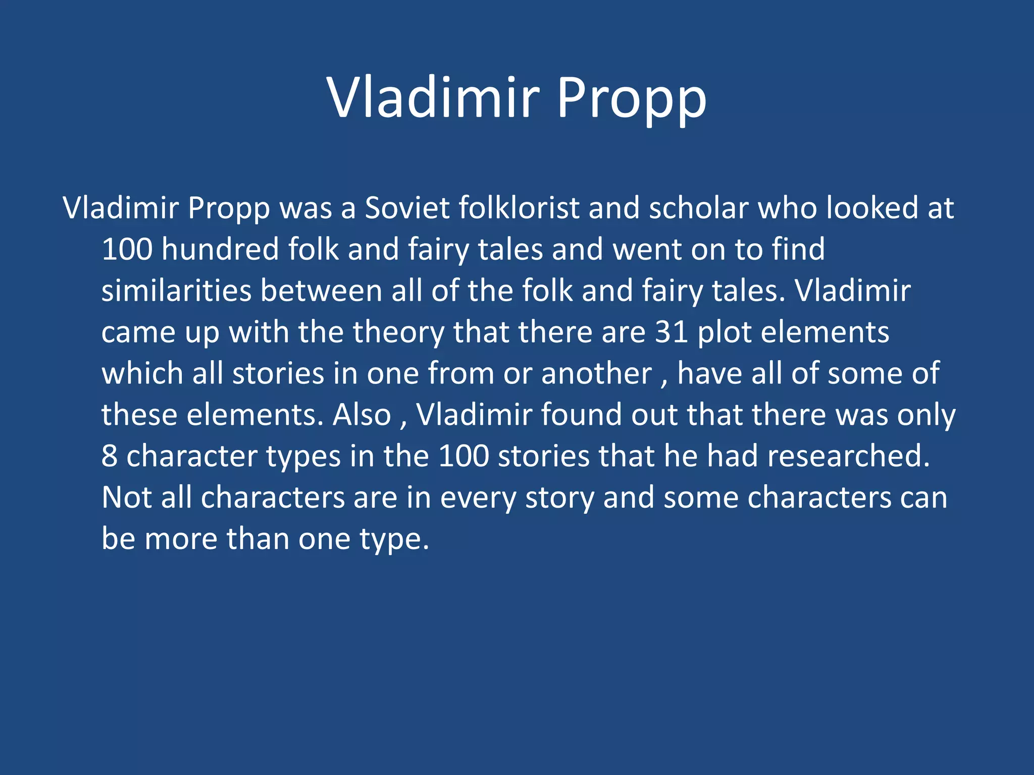 Vladimir Propp analyzed 100 folktales and found that they shared 31 plot elements and 8 character types. Tzvetan Todorov proposed that all stories follow a three-step structure: equilibrium, disruption of equilibrium, and return to a new equilibrium. Claude Levi-Strauss suggested narratives are driven by binary oppositions between two opposing sides. The document then discusses various character archetypes found in folktales (e.g. hero, villain, donor), narrative structures (e.g. linear, non-linear), and styles (e.g. realist, anti-realist).
