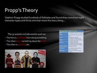 The document summarizes two narrative theories - Vladimir Propp's theory of character types and plot events in folktales, and Claude Levi-Strauss's theory of binary oppositions in narrative. It then explains how an opening sequence for a teen horror genre film fits aspects of both theories, containing some of Propp's character types and events and establishing various good vs evil binary oppositions described by Levi-Strauss.