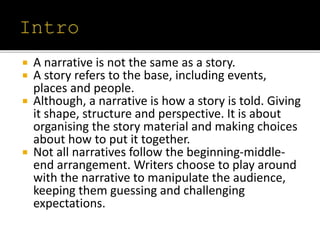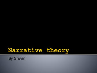 This document summarizes several narrative theories proposed by different theorists. Vladimir Propp analyzed Russian folktales and identified 8 common character archetypes. Tzvetan Todorov suggested narratives follow a 5 stage structure of equilibrium, disruption, realization, restored order, and new equilibrium. Rolland Barthes identified 5 codes that make up a narrative: hermeneutic, proairetic, semantic, symbolic, and cultural.