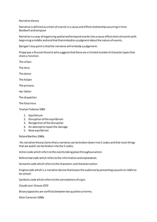 Narrative theory proposes that stories are organized as a causal chain of events unfolding over time, from a beginning to a middle and an end. Theorists have identified common narrative structures, such as Propp's character archetypes like the hero and villain, and Tzvetan Todorov's model of equilibrium being disrupted, the disruption being recognized, an attempt to repair the damage, and a new equilibrium. Roland Barthes identified five codes that most narratives can be broken down into: action, referential, semantic, enigmatic, and symbolic. Claude Levi-Strauss analyzed how binary oppositions like conflicts between qualities drive narratives. Later theorists explored nonlinear narrative forms.