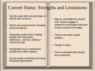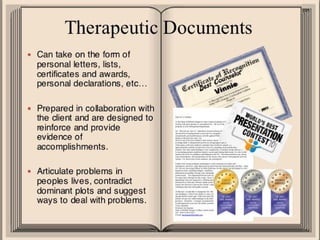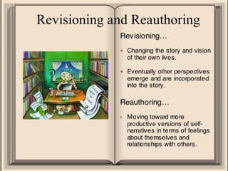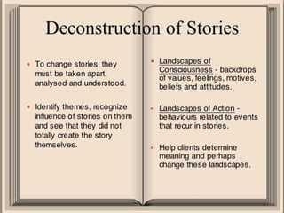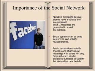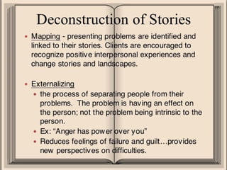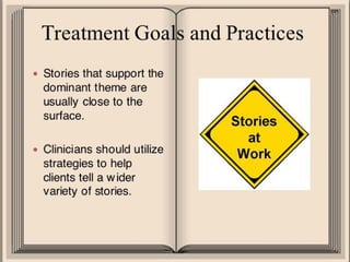 This document discusses the principles of narrative therapy. It states that people make meaning and understand themselves through the stories they hear and tell. Problems are shaped by social and cultural contexts rather than being inherent to the individual. The narrative therapist acts as a facilitator who helps clients develop new insights and empowerment by drawing attention to subtle changes, allowing clients to become authors of their own lives. Therapists are supportive and never judge, instead offering new perspectives to help clients find new meanings in their stories.