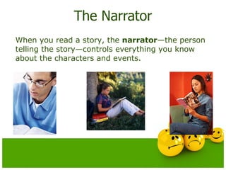 The document discusses different types of narrators and points of view in stories. It describes omniscient narrators, who know everything about all characters, and first-person narrators, who experience the story in their own voice using pronouns like "I". It also covers third-person limited narrators, who see the story through the eyes of one character using pronouns like "he" or "she". Examples are provided to illustrate how to identify each type of narration.