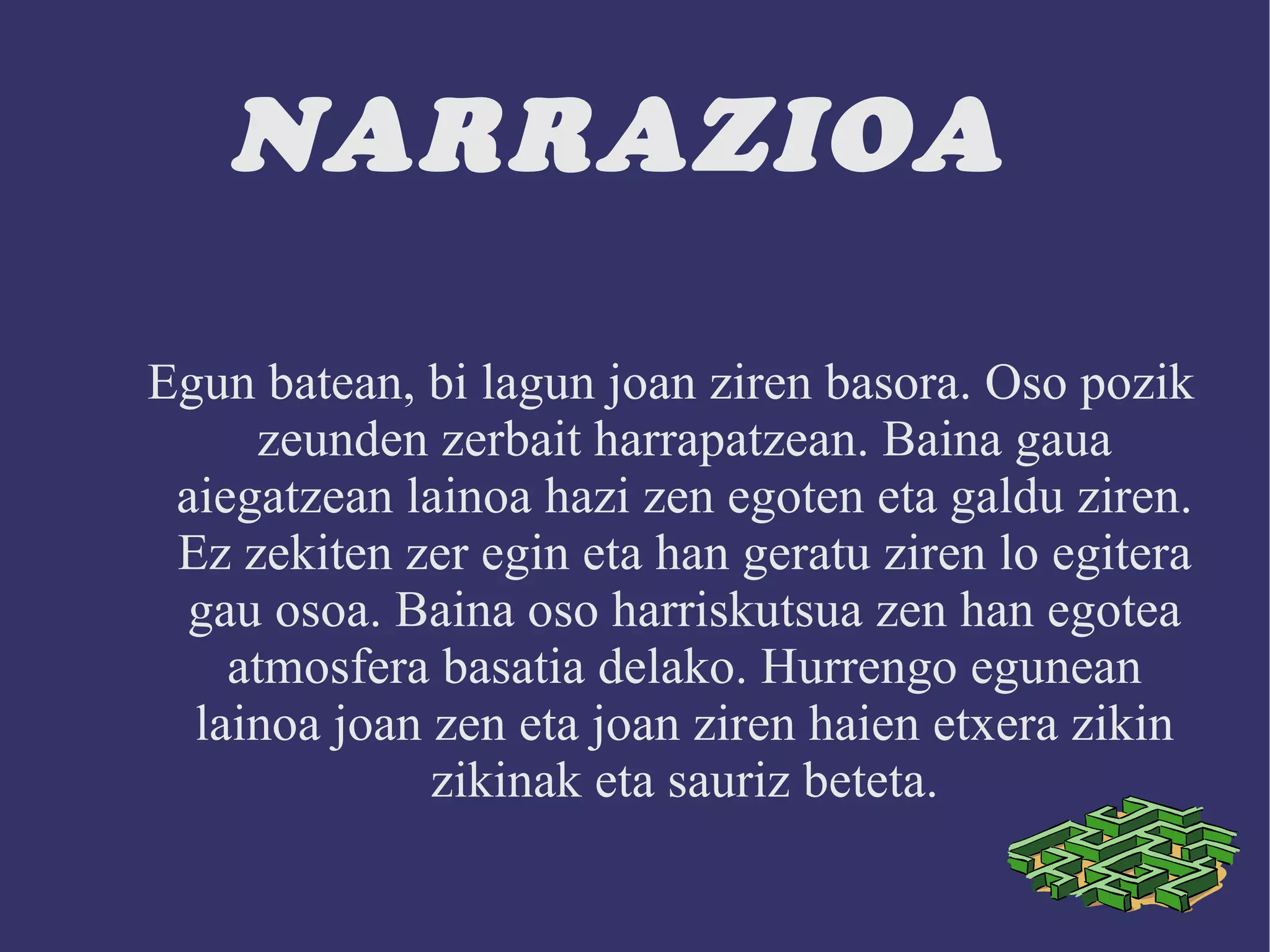 NARRAZIOA Egunbatean, bi lagun joan ziren basora. Oso pozik zeunden zerbait harrapatzean. Baina gaua aiegatzean lainoa hazi zen egoten eta galdu ziren. Ez zekiten zer egin eta han geratu ziren lo egitera gau osoa. Baina oso harriskutsua zen han egotea atmosfera basatia delako. Hurrengo egunean lainoa joan zen eta joan ziren haien etxera zikin zikinak eta sauriz beteta.