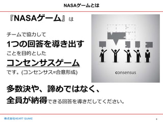 2 株式会社HEART QUAKE NASAゲームとは 『NASAゲーム』は チームで協力して 1つの回答を導き出す ことを目的とした コンセンサスゲーム です。(コンセンサス=合意形成) 多数決や、諦めではなく、 全員が納得できる回答を導きだしてください。