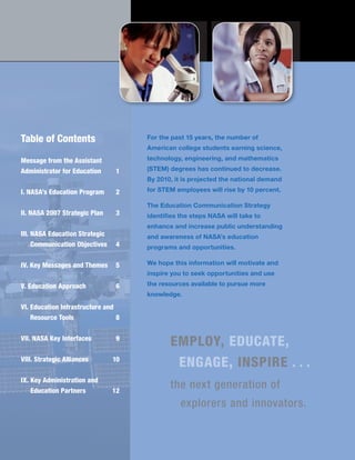 - It provides an overview of NASA's education goals, programs, resources and partnerships to coordinate strategic communications that support exploration and STEM literacy.