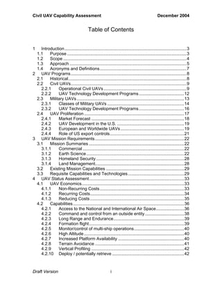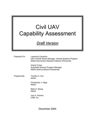 This document provides a draft assessment of civil uninhabited aerial vehicle (UAV) missions and technologies. It identifies 35 potential civil UAV missions across earth science, homeland security, commercial, and land management categories. From these missions, the document determines 21 key capabilities and technologies needed to support the missions, such as access to national airspace, long range/endurance, and over-the-horizon communication. The document also discusses the current state and development status of these capabilities. The goal is to complement the Department of Defense's UAV roadmap and help guide funding to develop enabling technologies for civil UAV missions.
