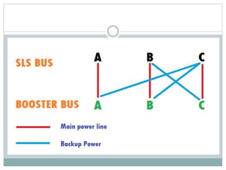 The Space Launch System uses two solid rocket boosters that provide most of the thrust during launch. Each booster contains propellant made of ammonium perchlorate, aluminum, and binders that ignite and burn for 124 seconds. The boosters are jettisoned at an altitude of 45 km after which parachutes deploy to slow their descent into the ocean for recovery. A range safety system can destroy the boosters by remote command if needed for safety.