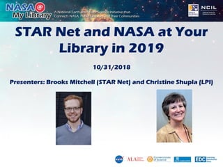 The document outlines an agenda for a library event focused on astronomy and space exploration, featuring presentations by Brooks Mitchell and Christine Shupla. It includes activities related to the solar system, human exploration, discussions, and resources for library staff to engage patrons in STEM learning. Additionally, it highlights collaboration opportunities with NASA and various astronomical organizations to enhance library programs.