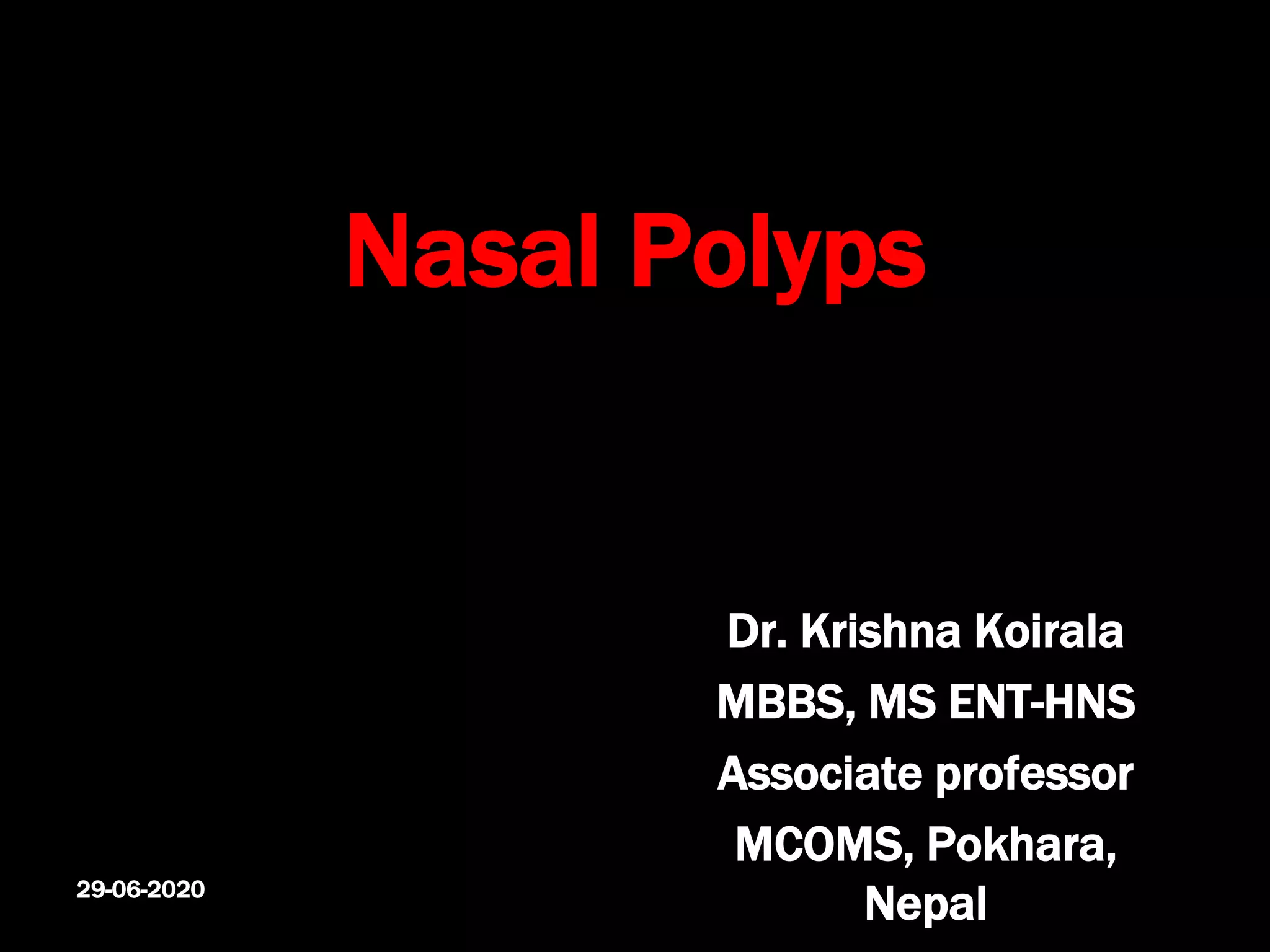 The document discusses nasal polyps, specifically antrochoanal and ethmoidal polyps, including their definitions, classifications, clinical presentations, and treatment options. It highlights the common symptoms in children and adults, the importance of diagnostic procedures like nasal endoscopy and CT scans, and various surgical and non-surgical treatments available. Preventive measures to reduce recurrence are also outlined, emphasizing complete removal and management of underlying conditions.