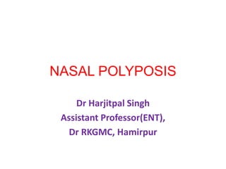 This document discusses nasal polyposis, including its definition, epidemiology, etiology, pathogenesis, pathology, symptoms, signs, diagnosis and treatment. Some key points include: