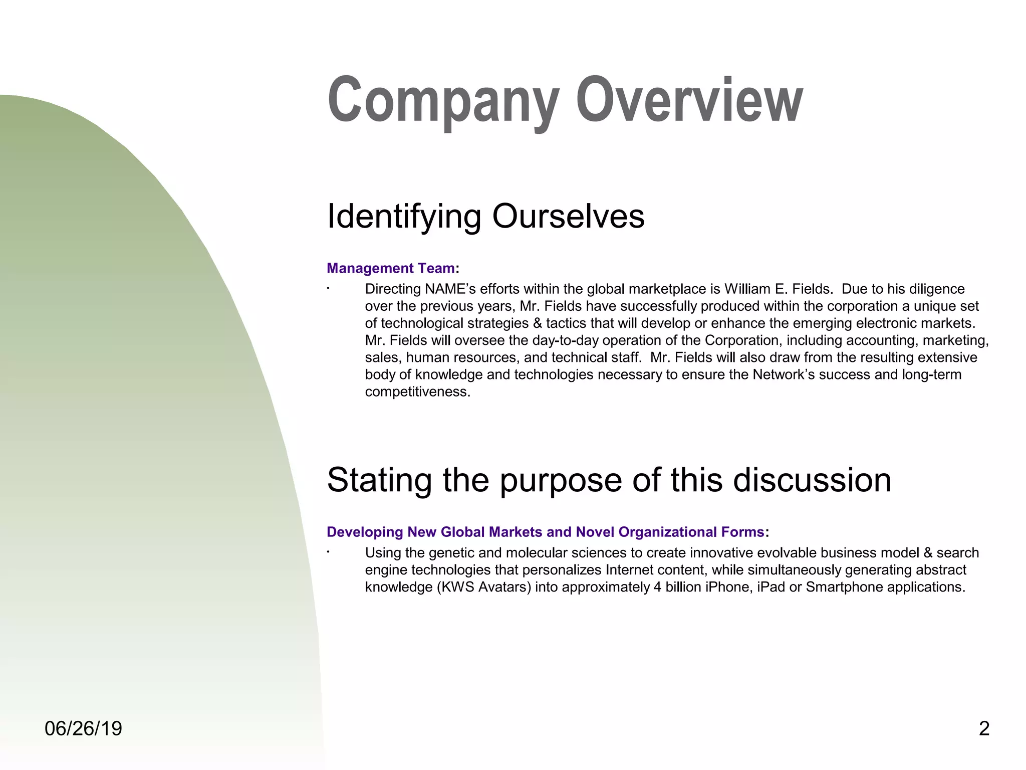 Nascent Applied Methods & Endeavors (NAME) is seeking $1.3 million in investment. It will use funds to acquire existing companies, found educational facilities, develop e-commerce platforms, market services, and hire staff. The company projects $42.1 million in revenue in 2020, growing to over $615 million by 2021 and $3.2 billion by the 5th year as it develops business models and applications using genetic and molecular sciences. It aims to have no direct competitors due to its unique approach and services.