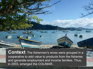 The women's cooperative COLIMAR was formed in 2003 in Governador Celso Ramos, Santa Catarina, Brazil to add value to local fishery products, generate employment and income for fishermen's families. Through the cooperative, fishermen's wives began producing foods like pastries and dumplings from fish and seafood to sell to restaurants and supermarkets. The NASDesign group provided training to the cooperative in design management, and developed their visual identity, packaging, signage, and ergonomic workstations.