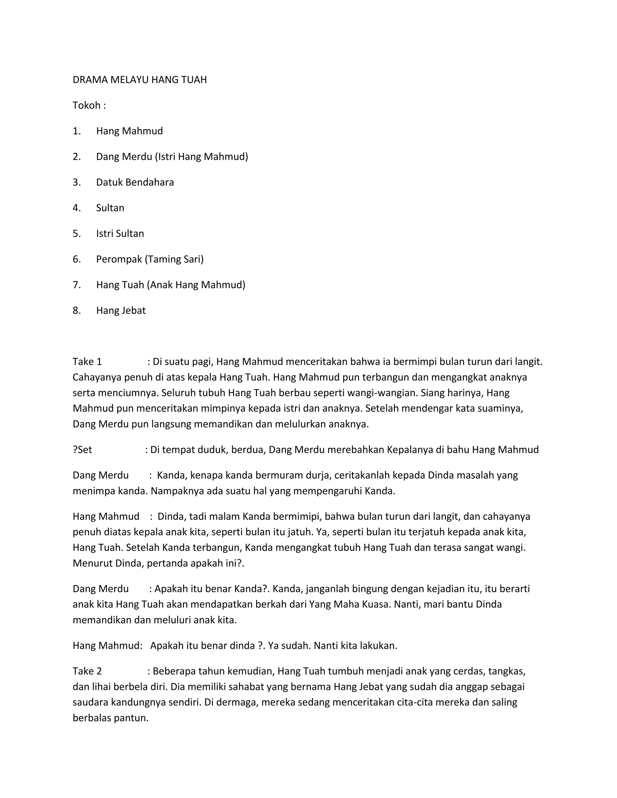 Drama Melayu 'Hang Tuah' mengisahkan perjalanan hidup Hang Tuah dan sahabatnya, Hang Jebat, yang penuh dengan konflik, keberanian, dan pengorbanan. Awalnya, mereka menunjukkan tekad untuk menjadi panglima lautan, namun perjalanan mereka diwarnai dengan pertikaian, penuduhan, dan pengkhianatan yang menguji persahabatan mereka. Drama ini mencapai klimaks ketika Hang Tuah harus menghadapi berbagai musuh dan akhirnya dihadapkan pada situasi tragis yang melibatkan kematian sahabatnya, Hang Jebat.
