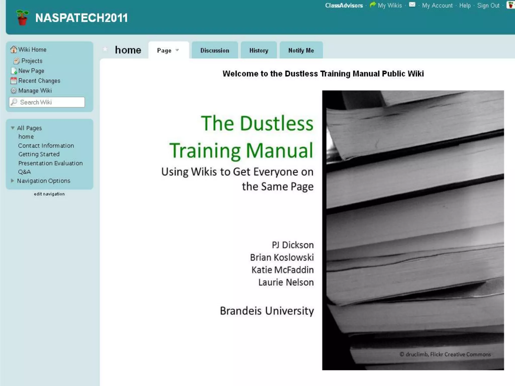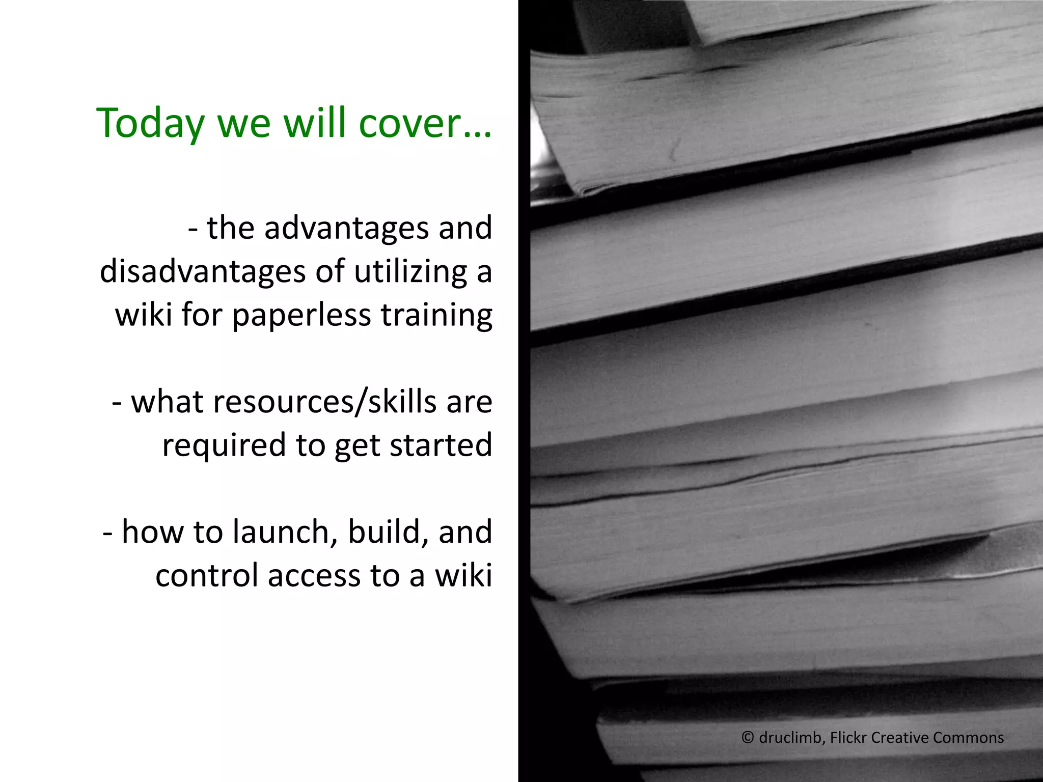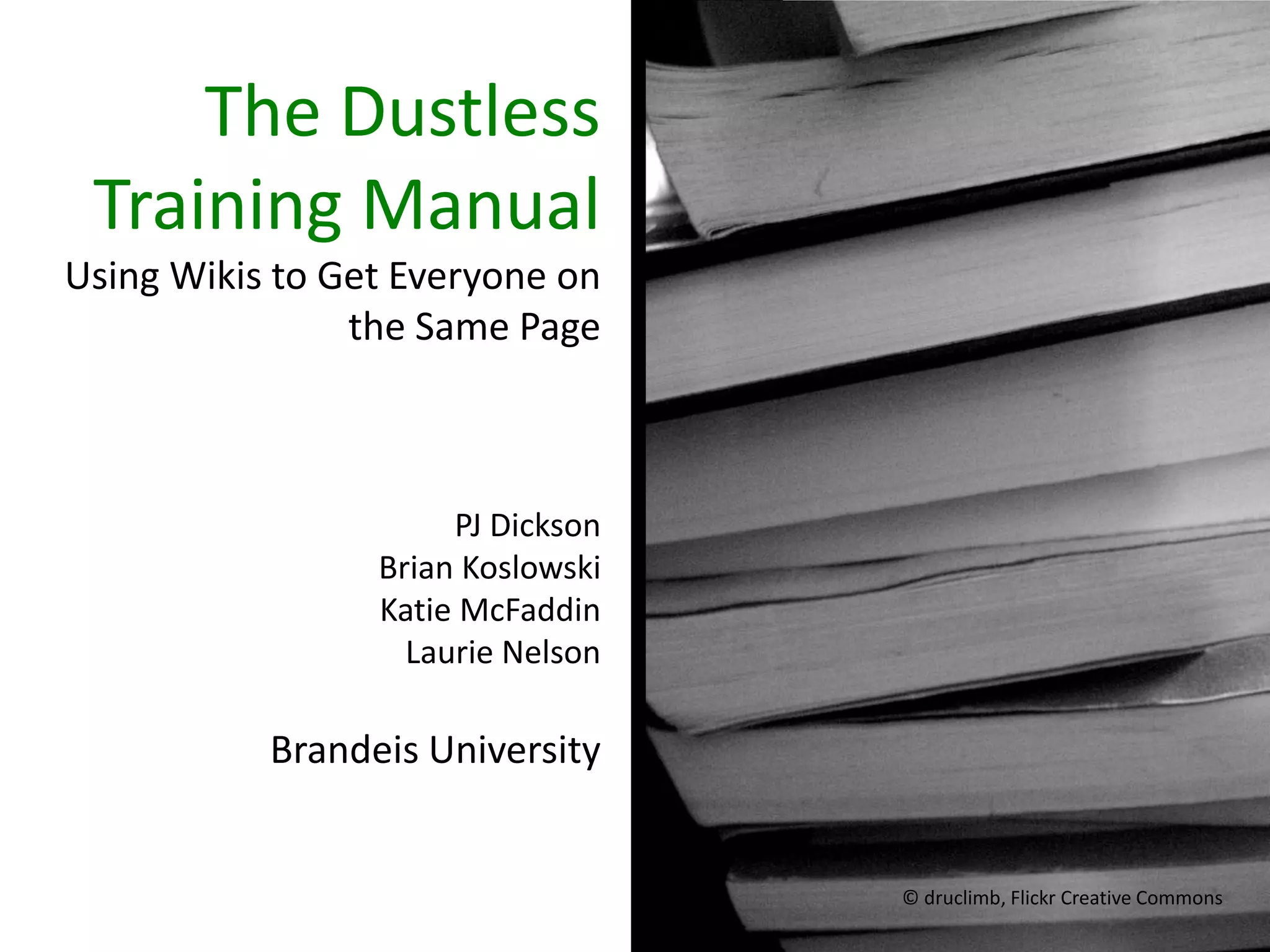 The document outlines the development of a wiki-based training manual for academic advisors at Brandeis University, aimed at addressing challenges such as high turnover and inefficient information sharing. It discusses the advantages of using a wiki over traditional methods, highlighting its collaborative and environmentally friendly nature, along with the minimal resources required to implement it. Additionally, it notes ongoing challenges and the need for continuous updates and expansion of wiki usage.
