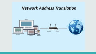 Network Address Translation (NAT) allows devices on a private network to use public IP addresses to access the Internet. NAT translates private IP addresses to public IP addresses to conserve the limited number of public addresses. There are three main types of NAT: static NAT assigns a public IP to a device; dynamic NAT uses a pool of public IPs; and port address translation uses ports of a single public IP for multiple private devices. NAT provides advantages like acting as a firewall and allowing unlimited private devices to share a single public IP. However, it also causes some applications to work less effectively and complicates troubleshooting when IP addresses change.