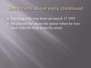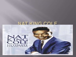 Nat King Cole was a famous American jazz pianist and singer who was born in 1919. He learned to play piano at age 4 and had both religious and classical training as a teenager before pursuing jazz. In the late 1930s, Cole formed the King Cole Trio, which toured extensively and found success on the charts in 1943. Cole made history as the first African American to host a national television show in 1956 and was a pioneering figure in challenging racial barriers in the music industry.