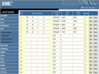This document discusses network address translation (NAT) and how it allows private IP addresses on a local network to connect to public IP addresses on the internet. It explains that NAT involves translating IP addresses and ports so that a private network can be represented by a single public IP address from the perspective of the internet. It also describes different types of NAT, such as basic NAT, port address translation, source NAT, and destination NAT. Specific scenarios like browsing the web, port forwarding, and issues with certain protocols like FTP are also covered at a high level.