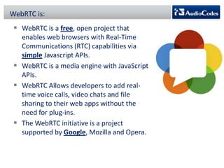 WebRTC is a project that enables real-time communication in web browsers using JavaScript APIs, allowing developers to implement voice calls, video chats, and file sharing without plugins. The document discusses the challenges of NAT traversal, particularly with symmetric NAT, and explains how tools like STUN and SBC (Session Border Controller) can assist in establishing reliable connections. Additionally, the ICE (Interactive Connectivity Establishment) framework is outlined for resolving connectivity during signaling by gathering various candidates for media communication.
